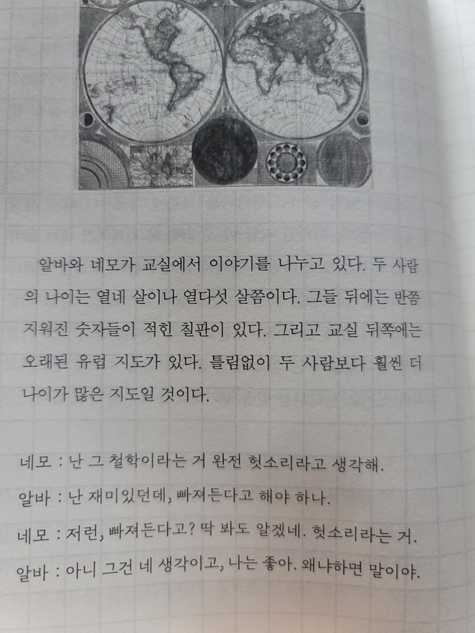 무엇보다 이런 철학자들과 그 시대를 설명하기 위해 '알바'와 '네모'라는 십대 중반의 인물들을 등장시켜 그들의 대화를 통해 그 시기 철학자들에 대한 이해를 돕고 있는데 서너 페이지의 짧은 대화지만 어찌 그리 핵심을 잘 표현해 주는지 감탄하게 된다.